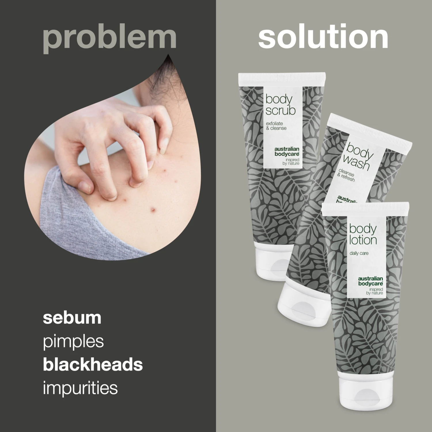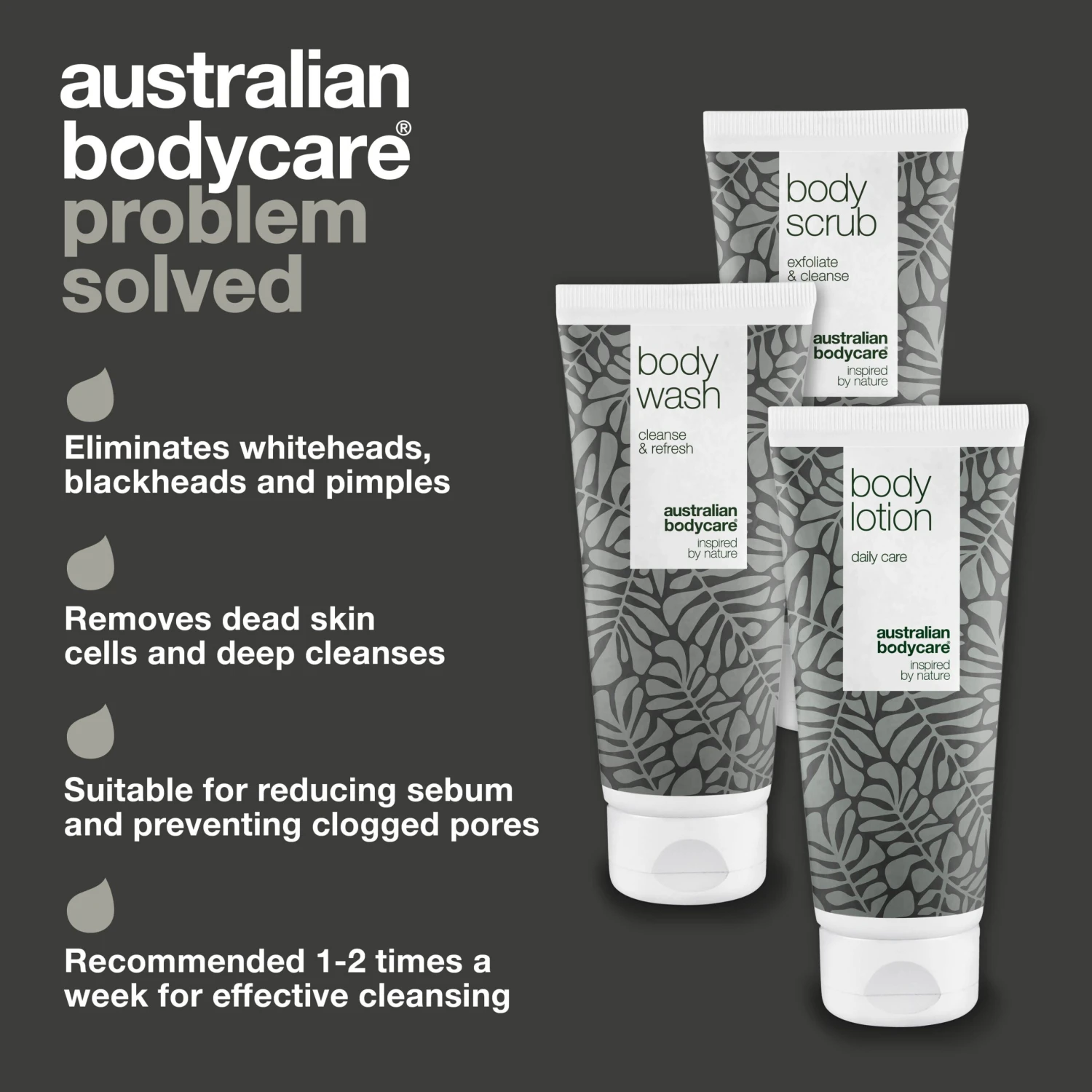 3 effective products to ensure a smooth skin, free from sebum plugs, whiteheads and other blemishes | The products in the body kit cleanse, remove dead skin cells, and ensure the right moisture level | With 100% natural Tea Tree Oil | Dermatologically tested and suitable for all skin types.