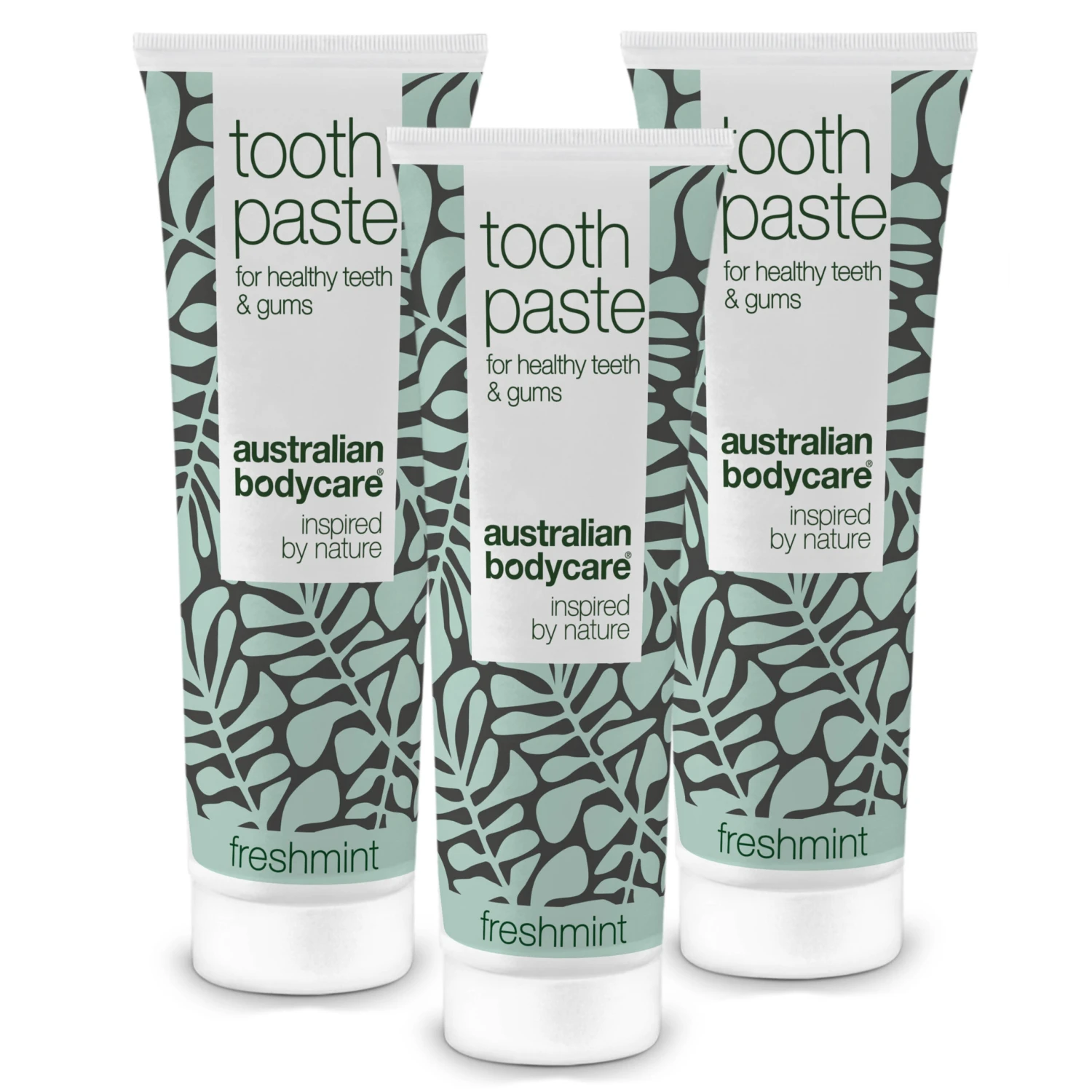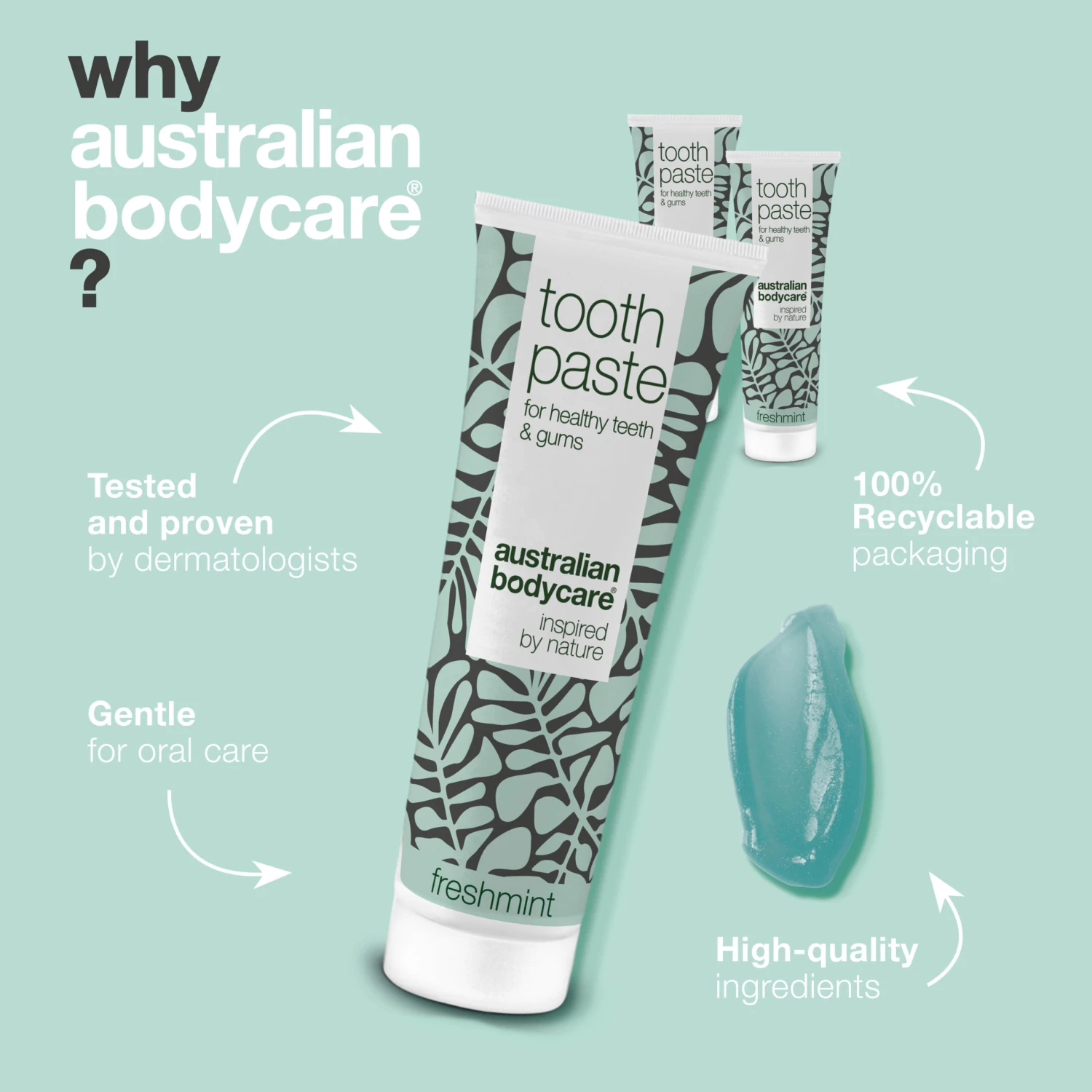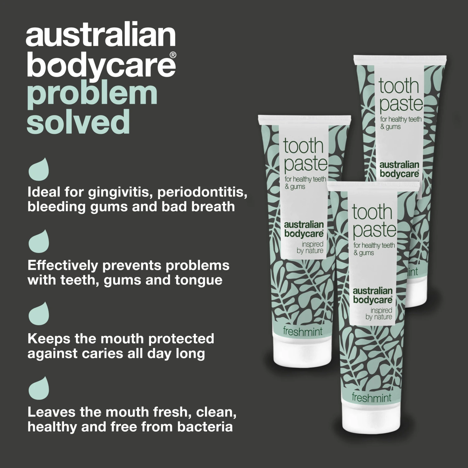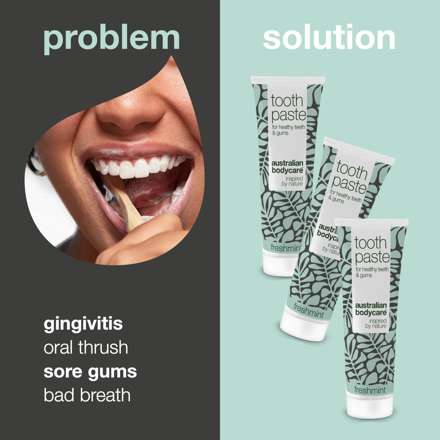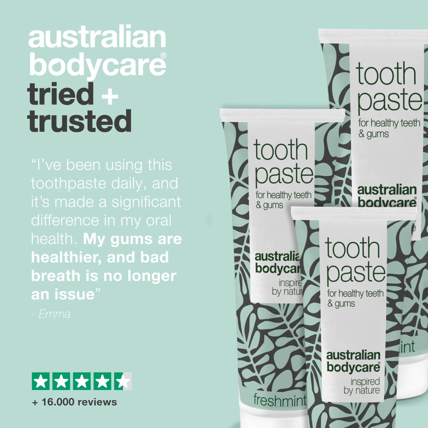 Do you want great oral hygiene free from teeth and gum problems? Then try our value pack of Tea Tree Oil Toothpaste | Tooth Paste with Tea Tree Oil, fluoride and zinc can be used for daily care of teeth, tongue and gums for periodontal disease, bleeding gums and bad breath | Leaves your mouth clean, fresh and bacteria-free | 100% vegan.