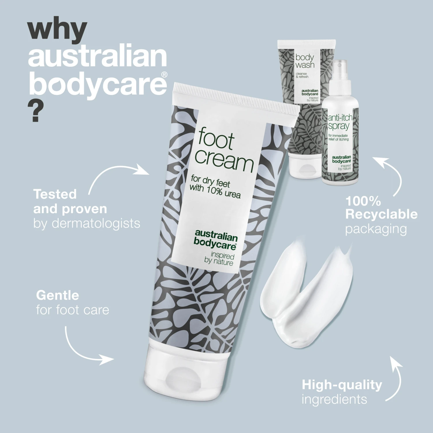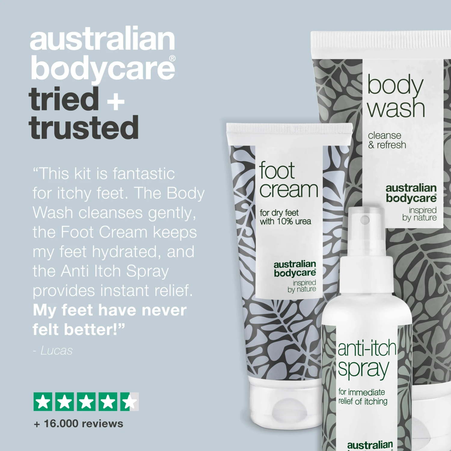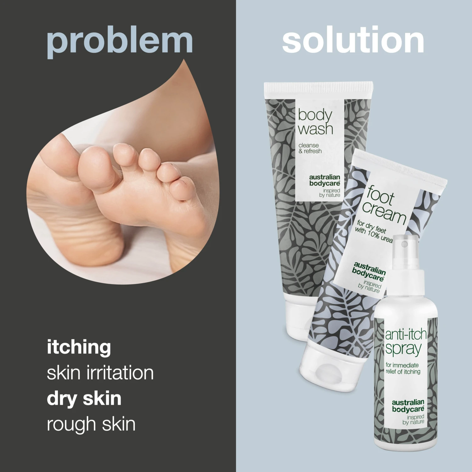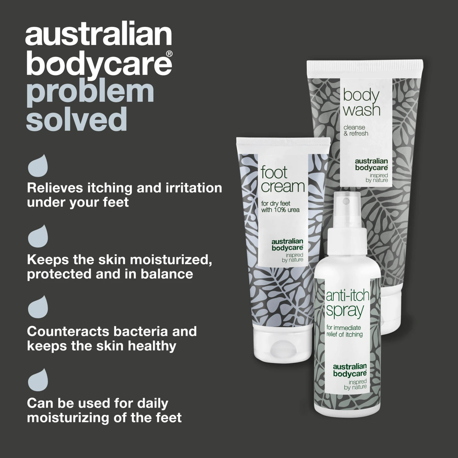 The package contains Body Wash 200 ml, Foot Cream 100 ml and Anti Itch Spray 100 ml.