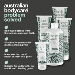 5 oral hygiene products for the daily care and cleaning of teeth, tongue, and gums | Tea Tree Oil Toothpaste, Mouthwash, and Mouth Gel ensure good oral hygiene and can be used for the daily care of periodontal disease, fungal infections, and other mouth irritations | Cleans and removes bacteria from tongue, gums, and teeth | Suitable for care of bad breath, dry mouth, as well as sore and bleeding gums.