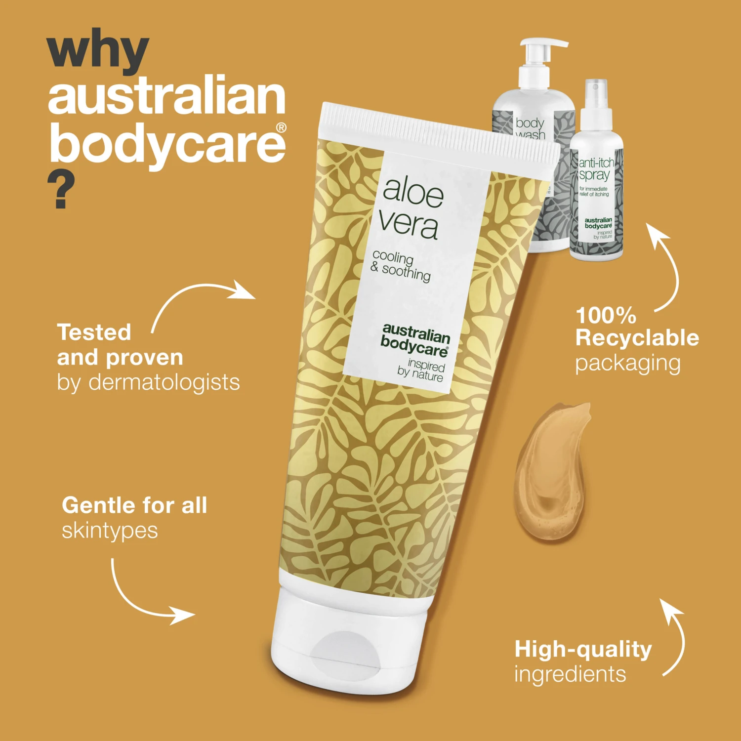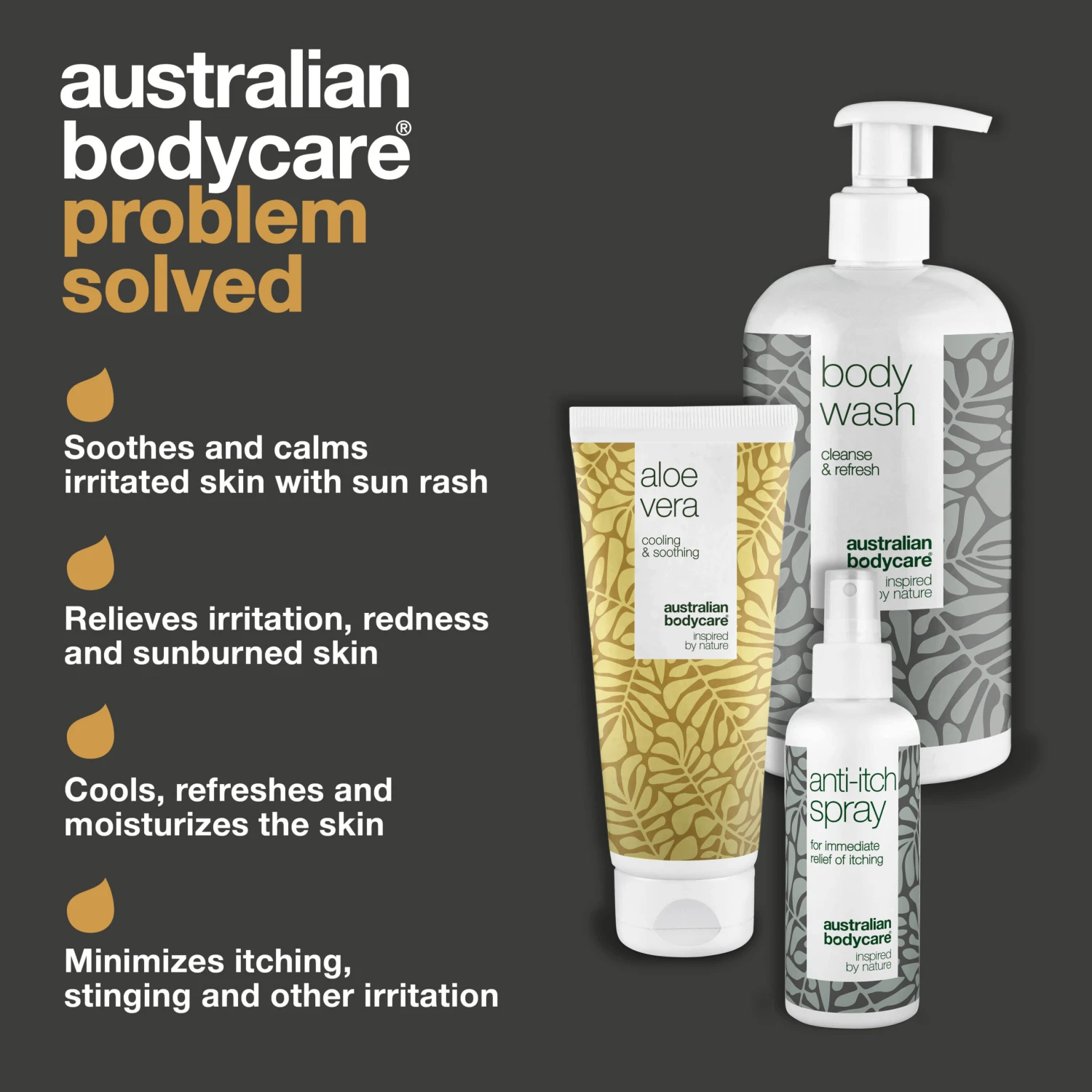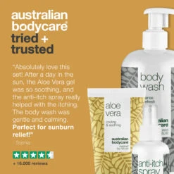 Cooling and moisturising products with Tea Tree Oil for the care for sun damaged skin, sunburn, redness and irritation | Body Wash, Aloe Vera Gel and Anti Itch Spray to moisturise and relieve sunburn itch and burning sensation | Shower Gel and After-sun for daily skin care for sunburn and itching spray to relieve irritation | For all skin types.