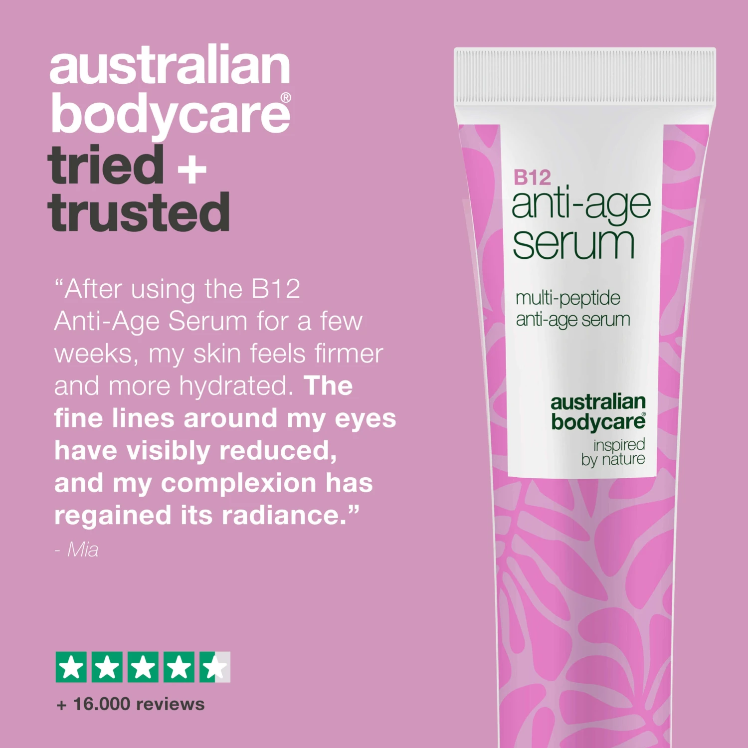 “B12 Anti Age Serum is inspired by the best ingredients nature has to offer. It’s designed to reduce signs of aging by strengthening and hydrating the skin, helping you achieve a youthful glow. Our skin experts have carefully selected ingredients that work together to give you the best care possible.” – Australian Bodycare Skin Expert