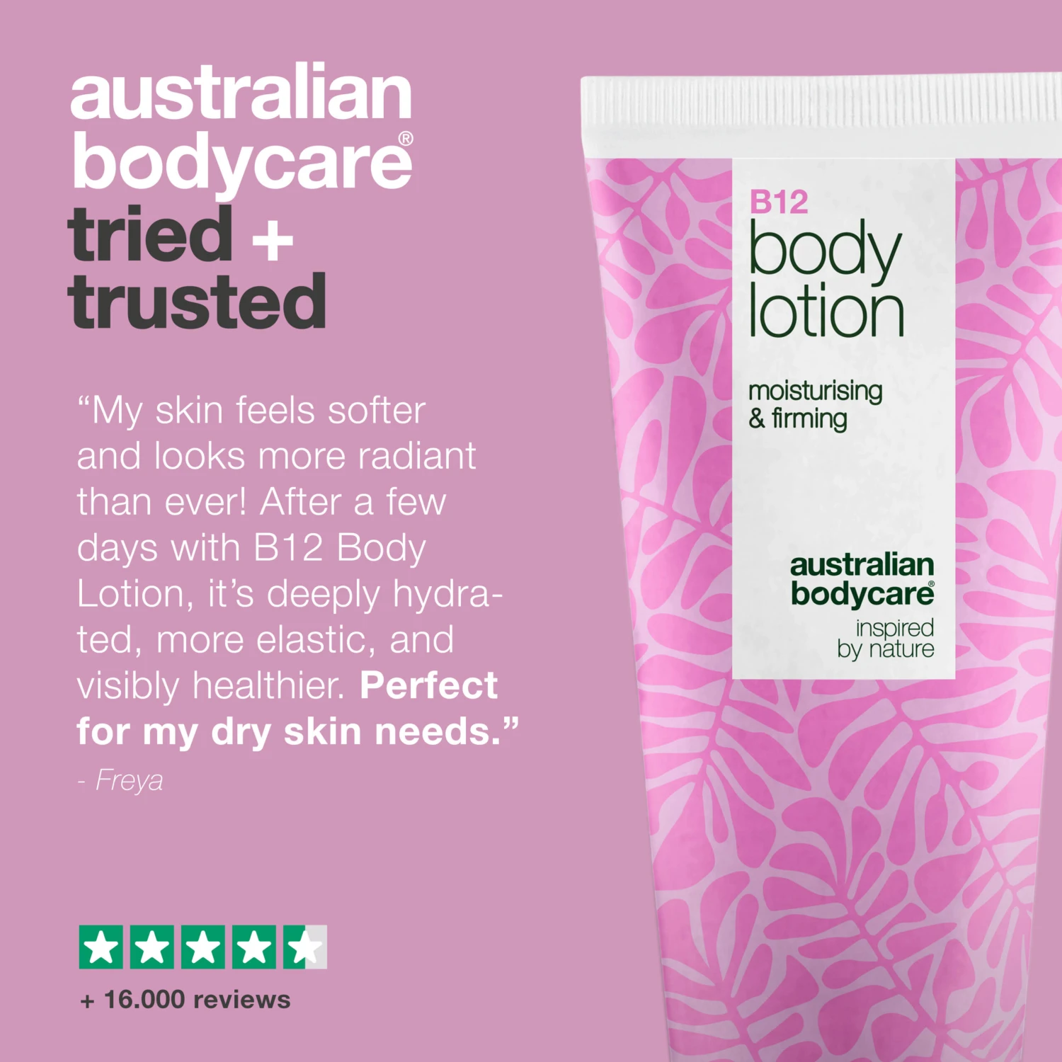 For the best results, we recommend using B12 body lotion in combination with other products from Australian Bodycare, like our B12 body scrub, which gently exfoliates the skin and prepares it for optimal moisture absorption.