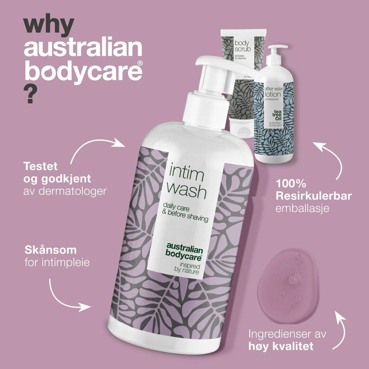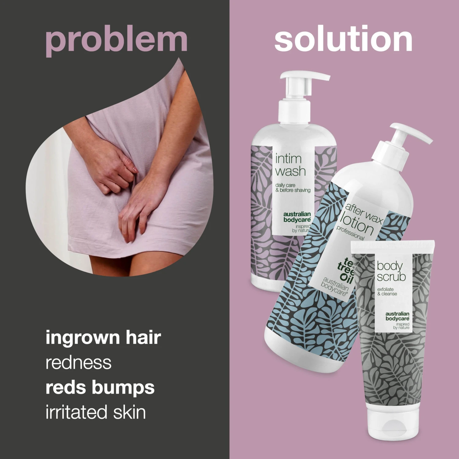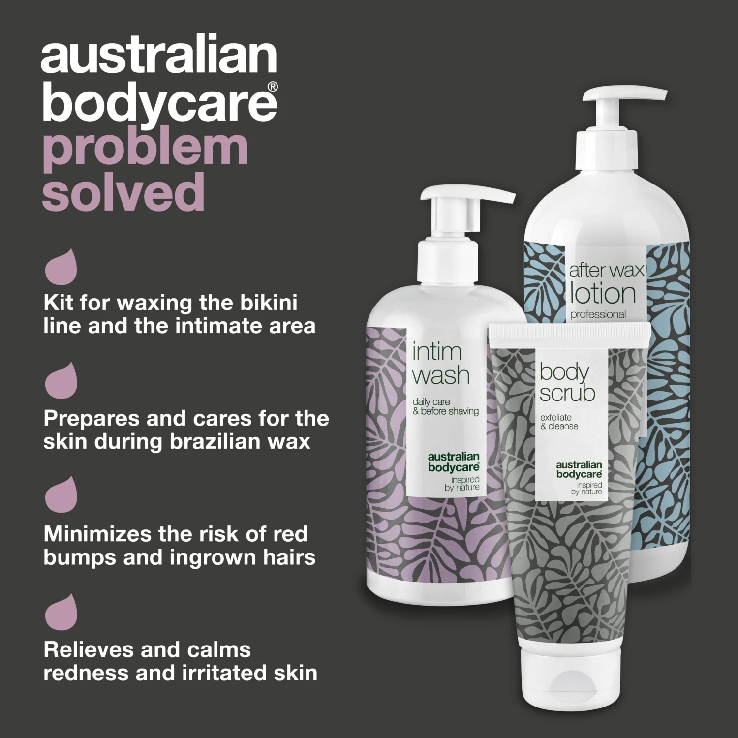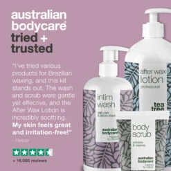 Intimate Wash 500 ml, Body Scrub 200 ml and After Wax Lotion 1000 ml. prepares and cares for the skin before and after brazilian wax treatment | Minimises the risk of ingrown hairs, redness and irritated skin after brazilian wax | Removes bacteria, dirt and cares for the skin after wax treatment | After Wax Lotion is part of the professional range created for beauty salons and clinics | Can also be used for skin care after shaving with a razor | 100% vegan and with natural Tea Tree Oil.
