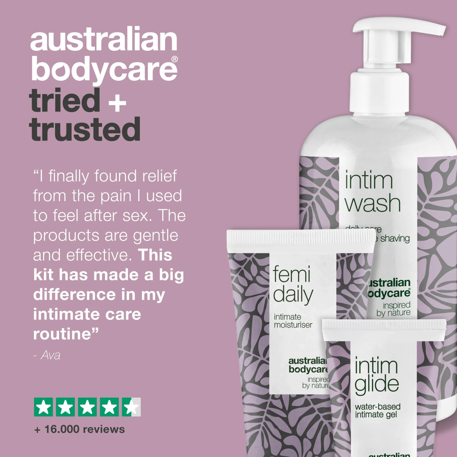 Intimate soap and 2x gels to relieve intimate irritation before, during and after sex | Can be used to care for intimate burning after intercourse | Reduces intimate burning during and after sex | pH-adapted to the intimate area – can be used by everyone | Dermatologically tested and based on 100% natural Tea Tree Oil.
