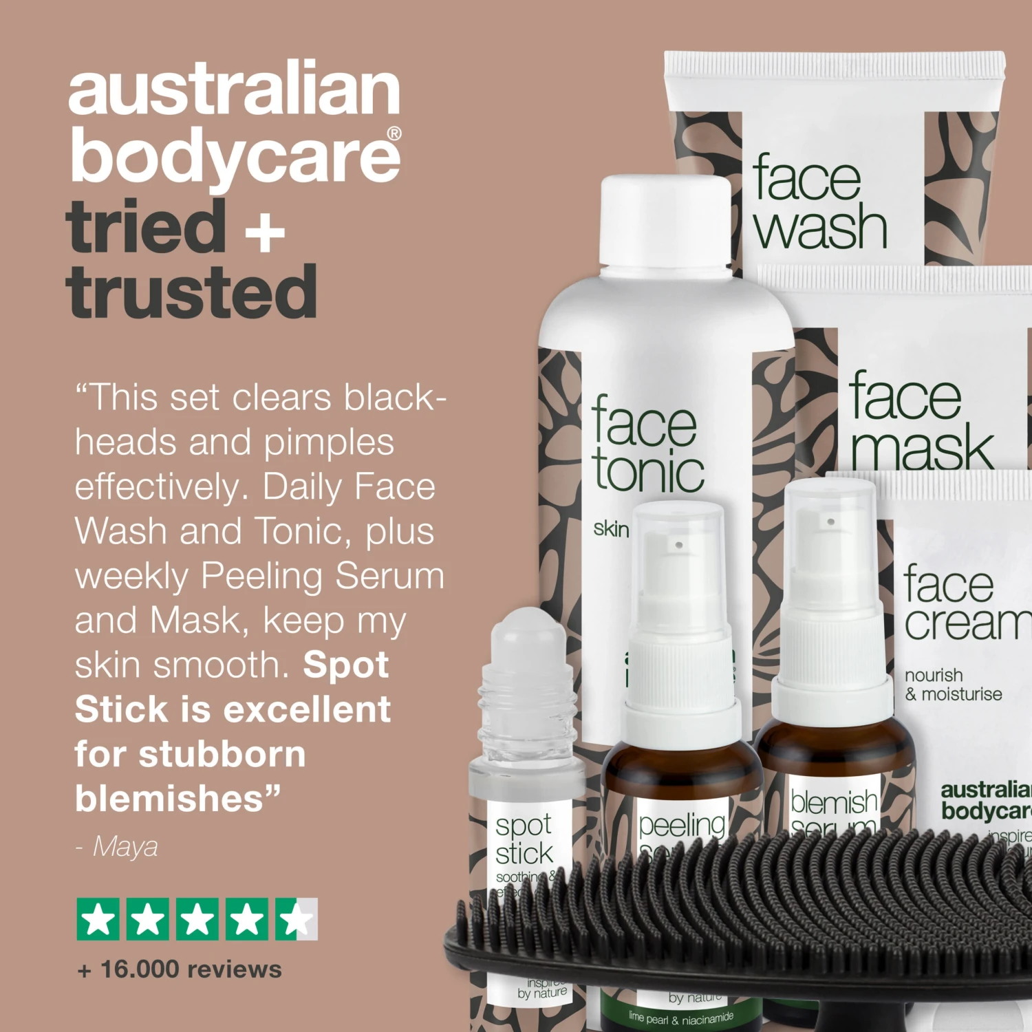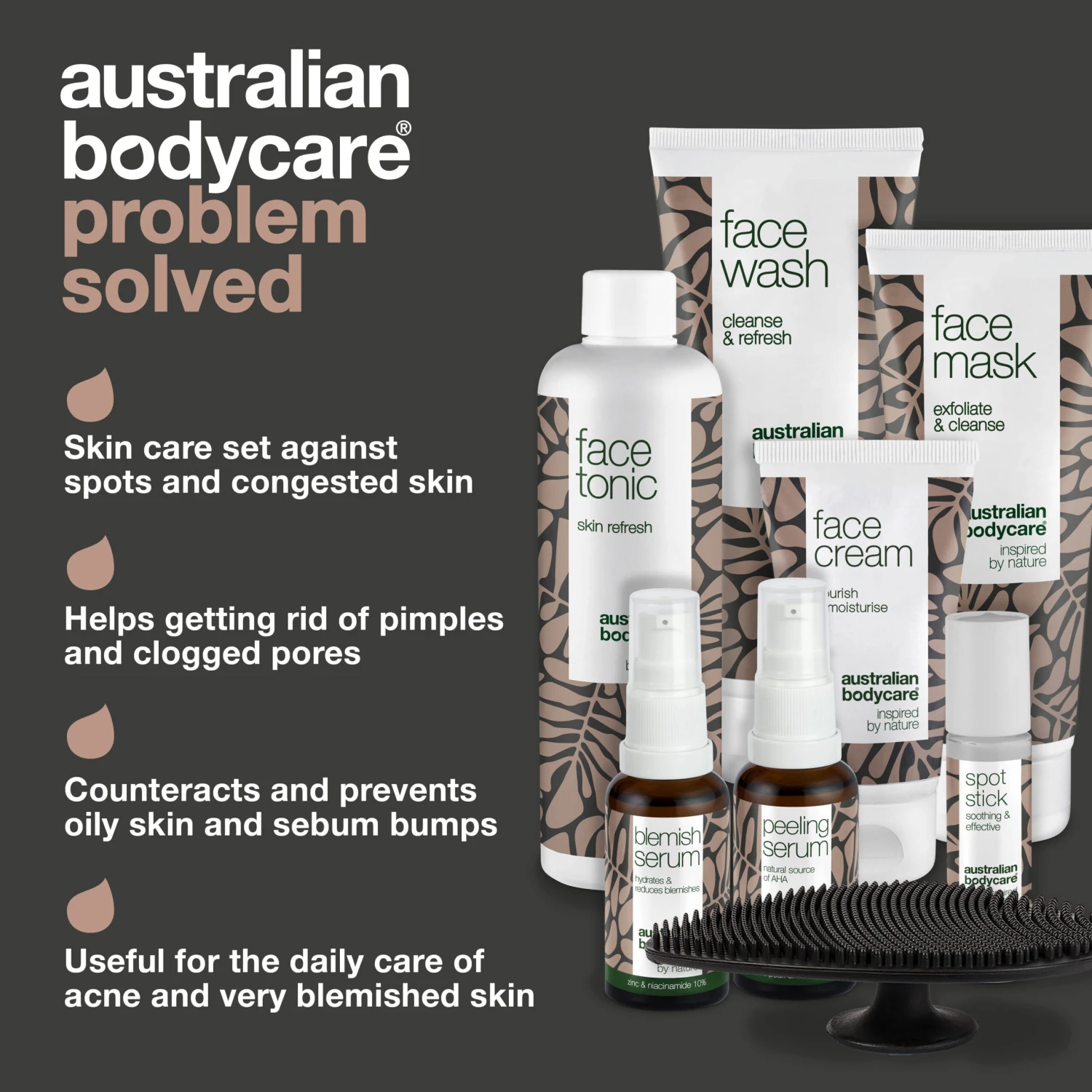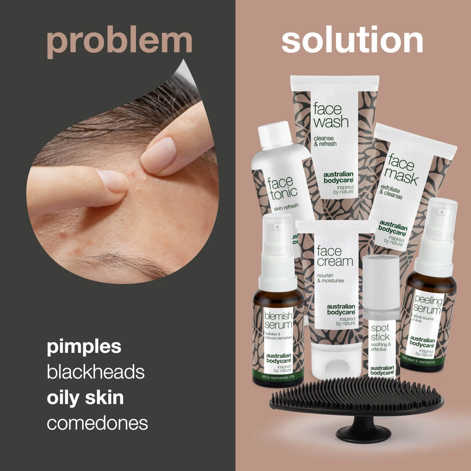 Do you suffer from oily and blemished skin? Spots, open comedones and whiteheads on your face? Our 8 face product set helps you get rid of clogged pores and pimples, and are suitable to use on acne prone skin | Complete facial treatment to counteract and prevent blemishes | Tea Tree Oil fights bacteria.