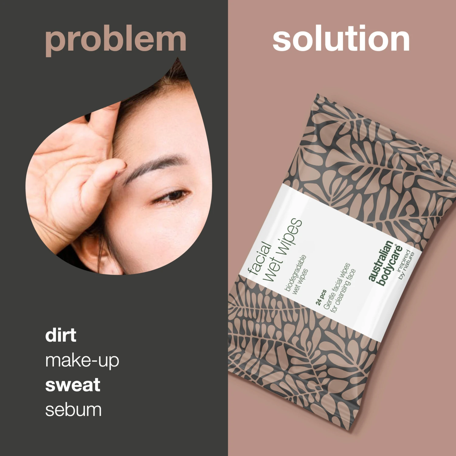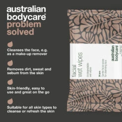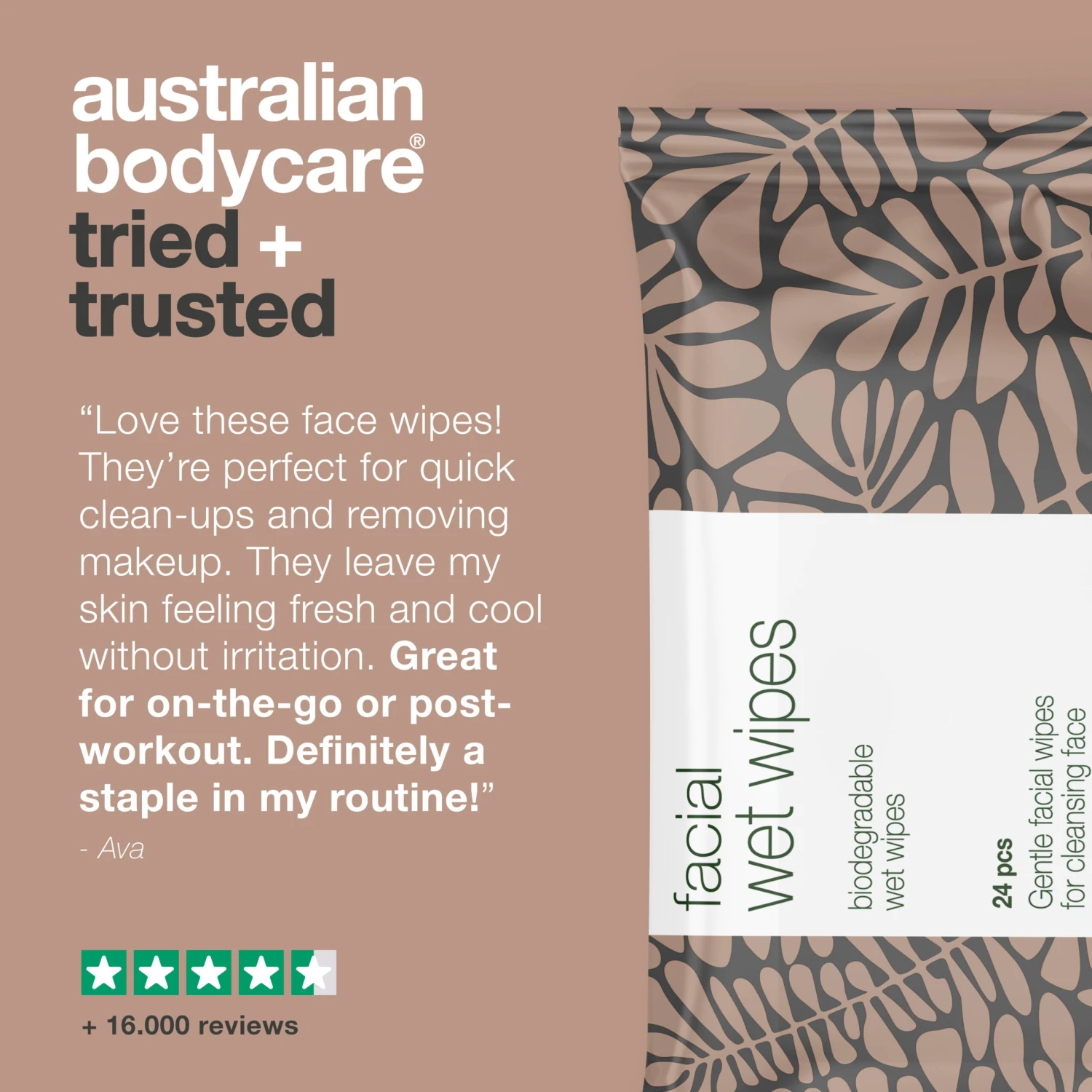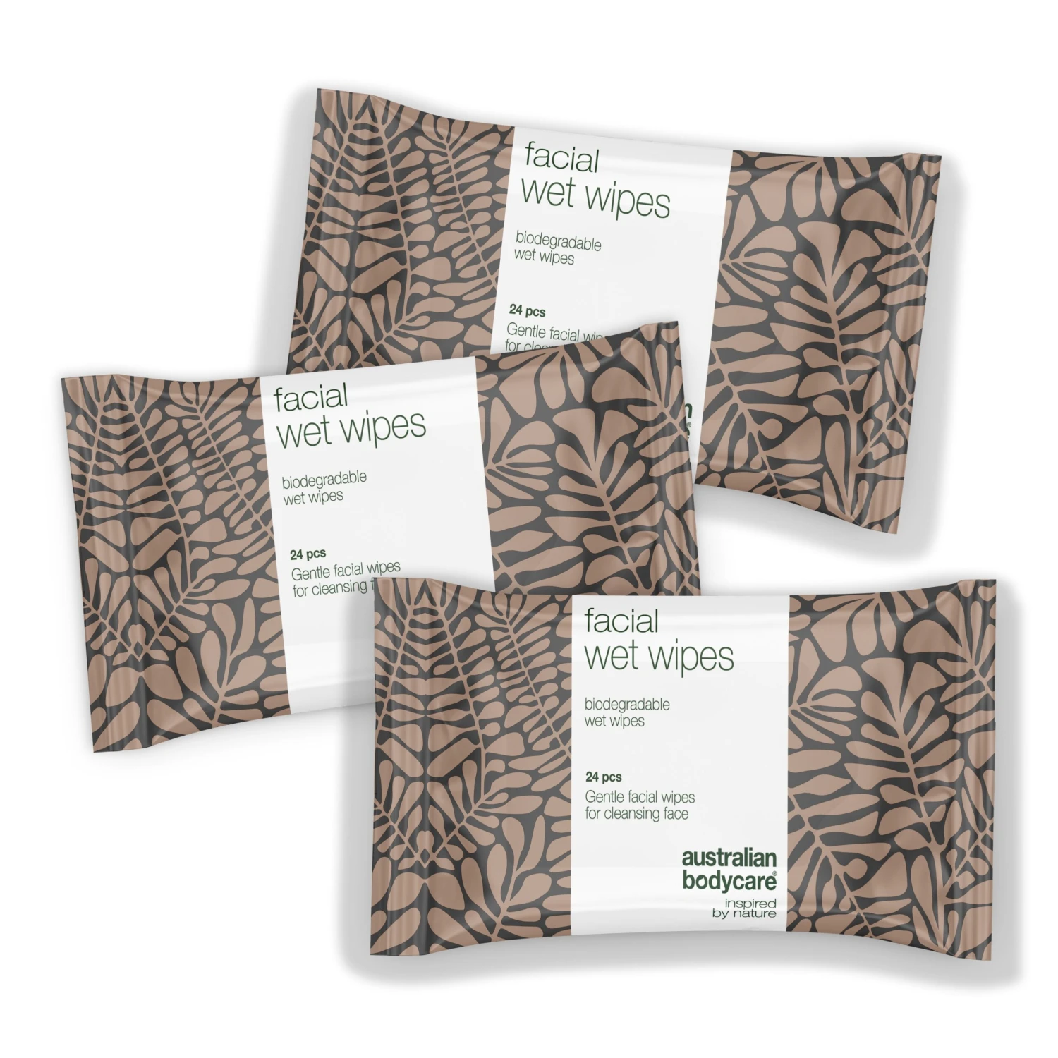 Facial wipes for removing makeup, dirt and bacteria | The wet wipes have a refreshing, cooling and soothing effect on the skin | Cleanses gently and effectively | The cleansing wipes can be used by all skin types to cleanse, refresh or cool the skin, e.g. after exercise or hot flashes | Infused with 100% natural Tea Tree Oil and made of biodegradable material.