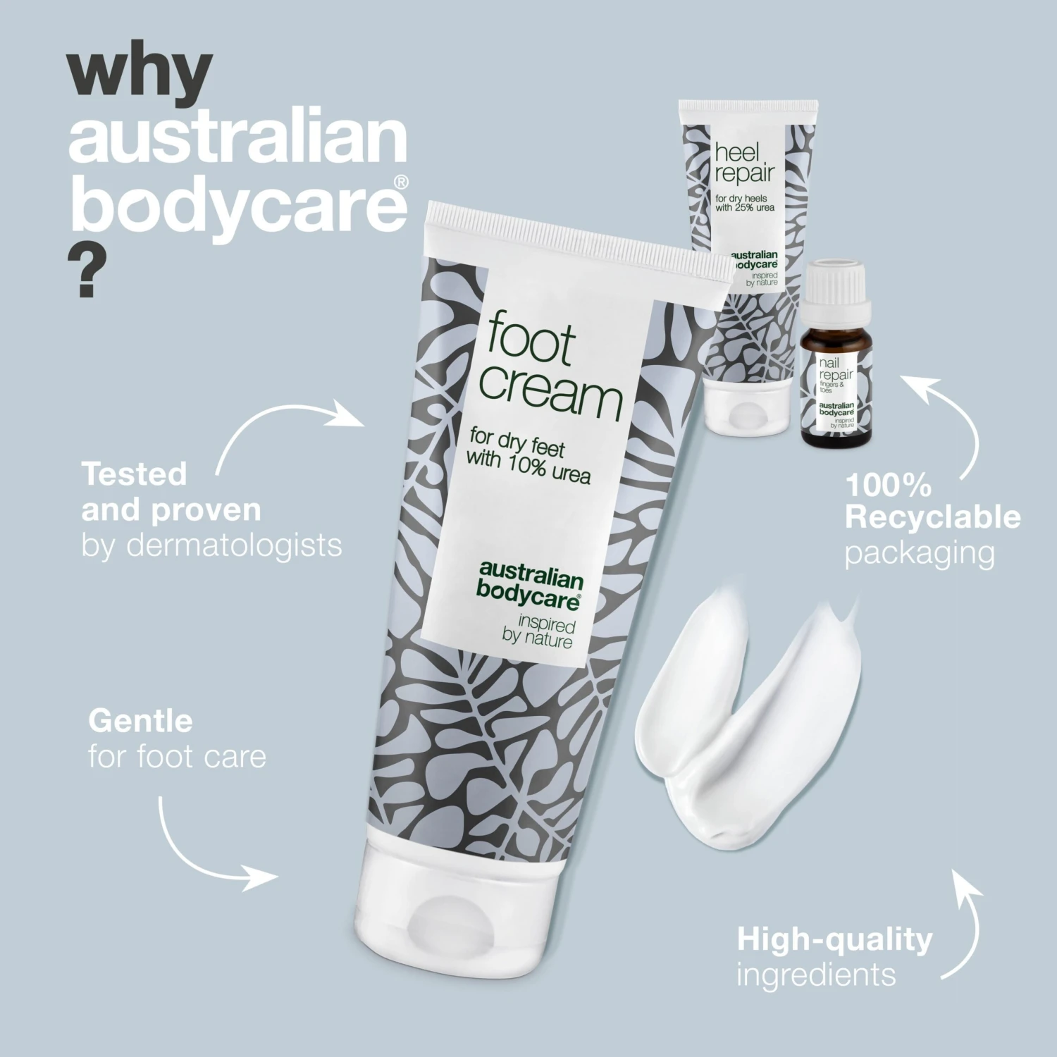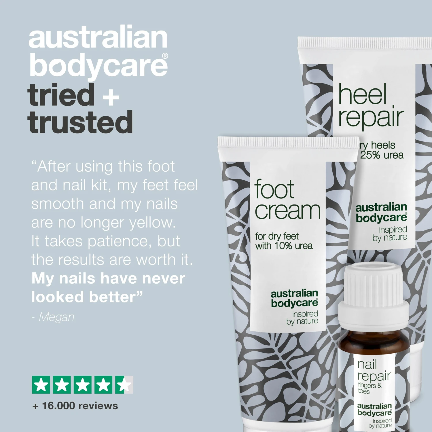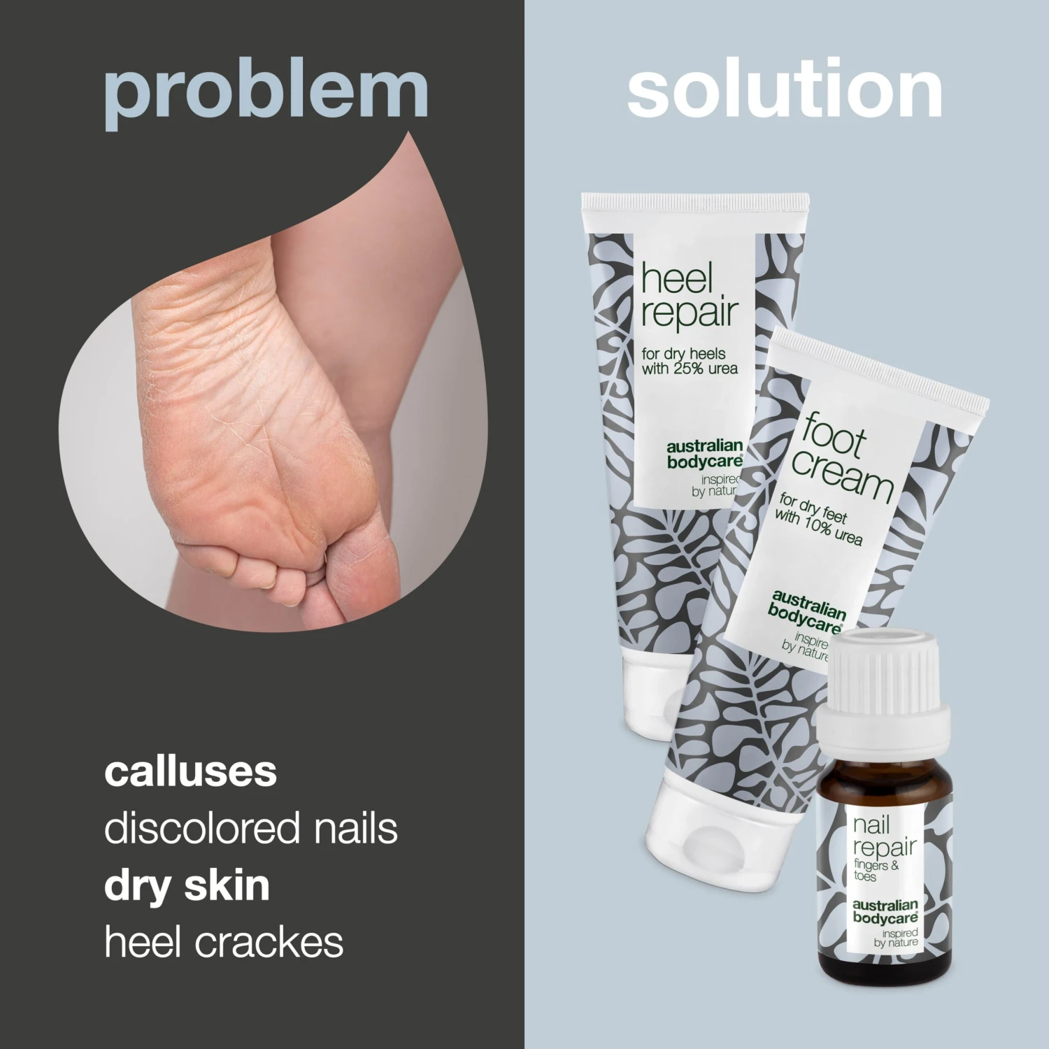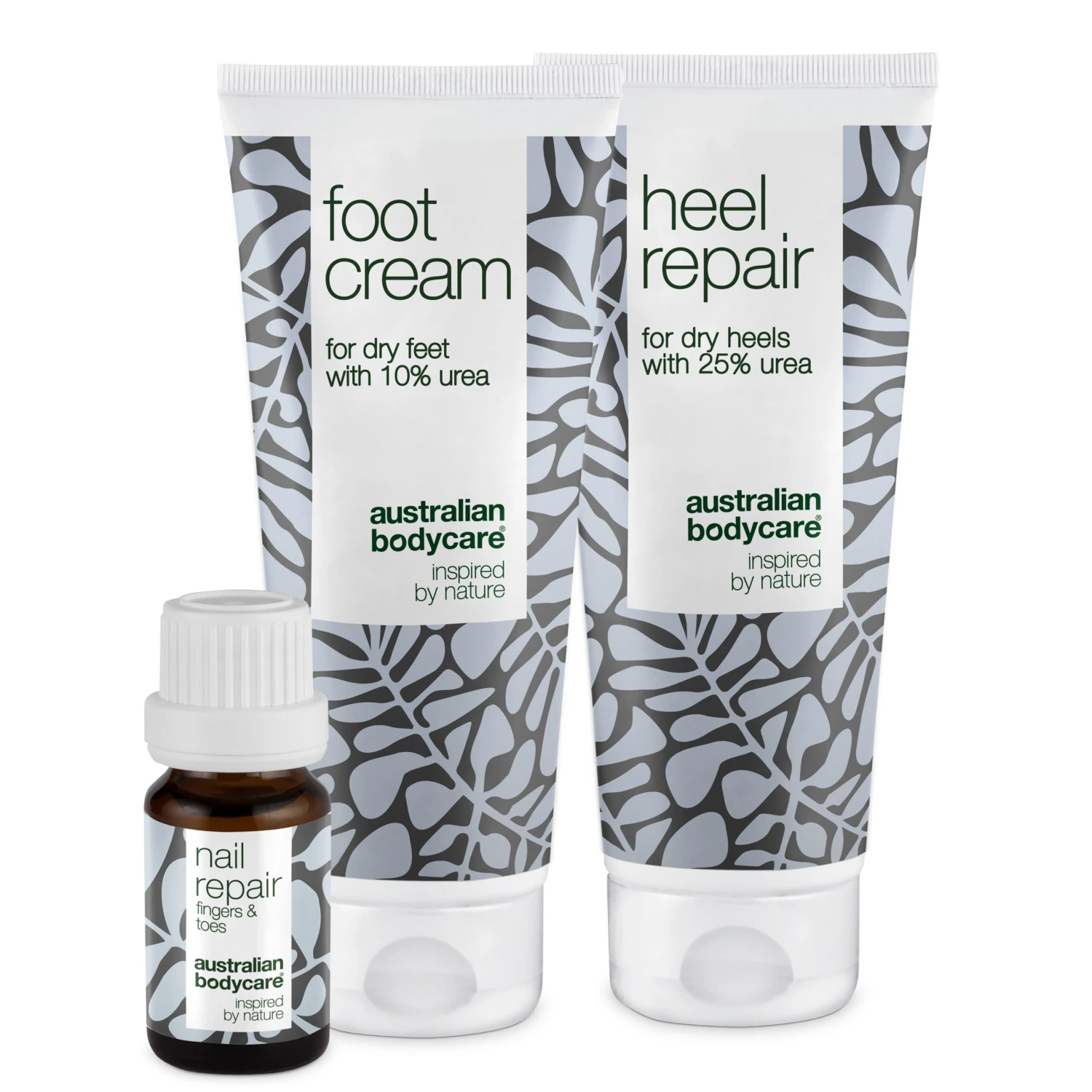 Foot care package with 3 products for the daily care of dry feet, callus and discoloured nails | Complete foot care package made to nourish and protect dry skin, callus and yellow nails | 100% natural Tea Tree oil counteracts bacteria and nail/foot problems | Foot cream and heel cream with a high content of Urea (10%/25%) prevents dry feet and callus | Nail oil with vitamin E for care of nail fungus.