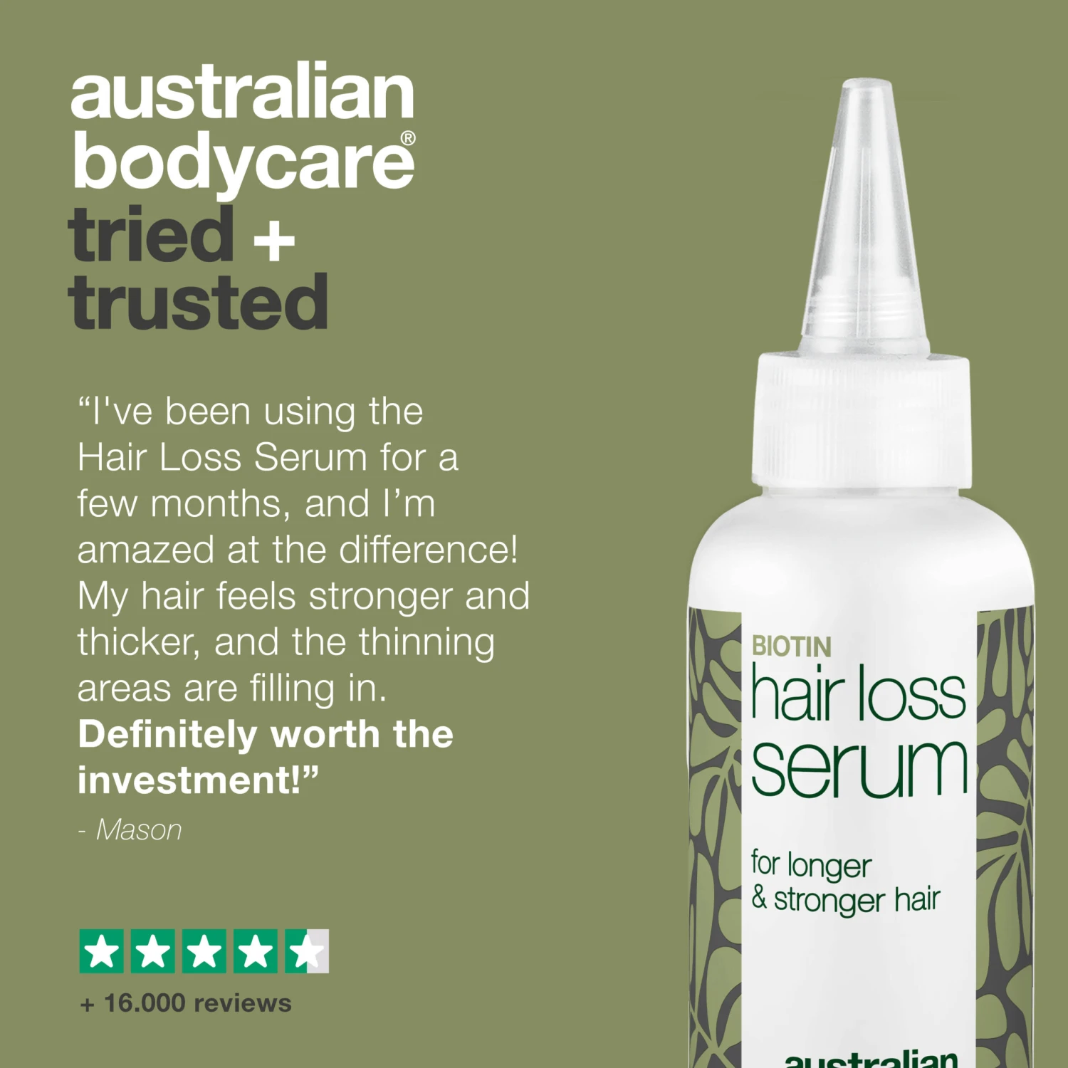 Daily use scalp serum | For both men and women | Nourishes hair and scalp | For hair loss, thinning and receding hairline | Contains the natural active ingredients Tea Tree Oil, Biotin and Capilia Longa (Turmeric Extract) | For best results combine with the shampoo and conditioner in the same product range.