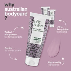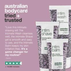 3 products for a smooth intimate shave, free from ingrown hair, shaving rash and shaving bumps. Contains intimate wash for daily cleansing, intimate shaving gel and aftershave balm to care for the skin of the intimate area. Contains 100% natural Tea Tree Oil that counteracts bacteria and dirt, which are the cause of irritation and razor bumps.