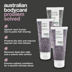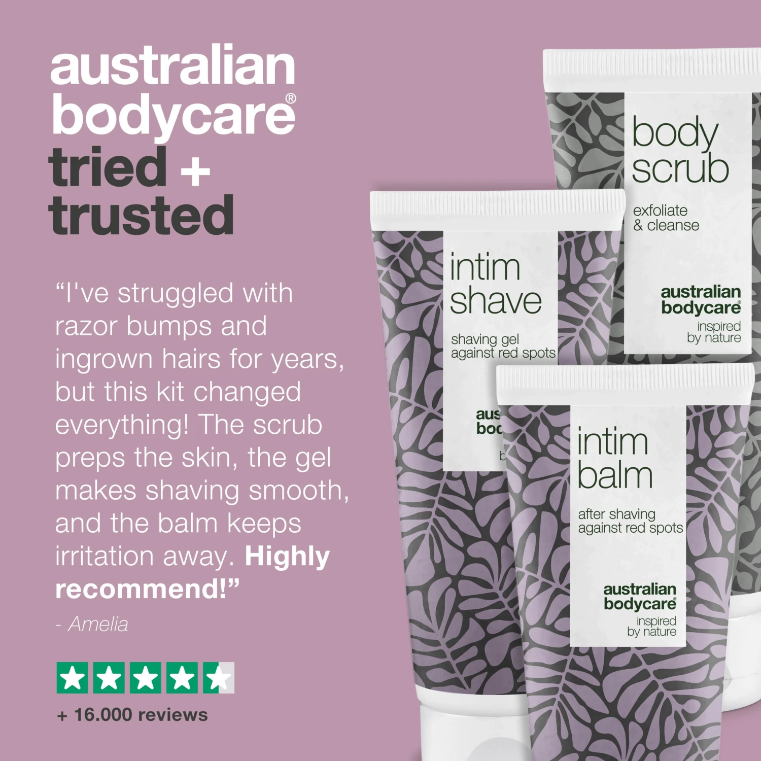 The pack contains Body Scrub (200 ml), Intim Shave (200 ml) and Intim Balm (200 ml).