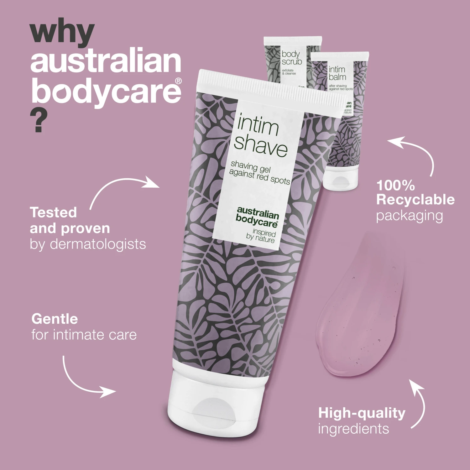Scrub, shaving gel and aftershave balm for shaving in the genital area | Protect skin and reduces red razor bumps, ingrown hair, redness and itching before, during and after shaving | Can be used by both men and women for intimate shaving | Tea Tree Oil reduces bacteria and irritation.