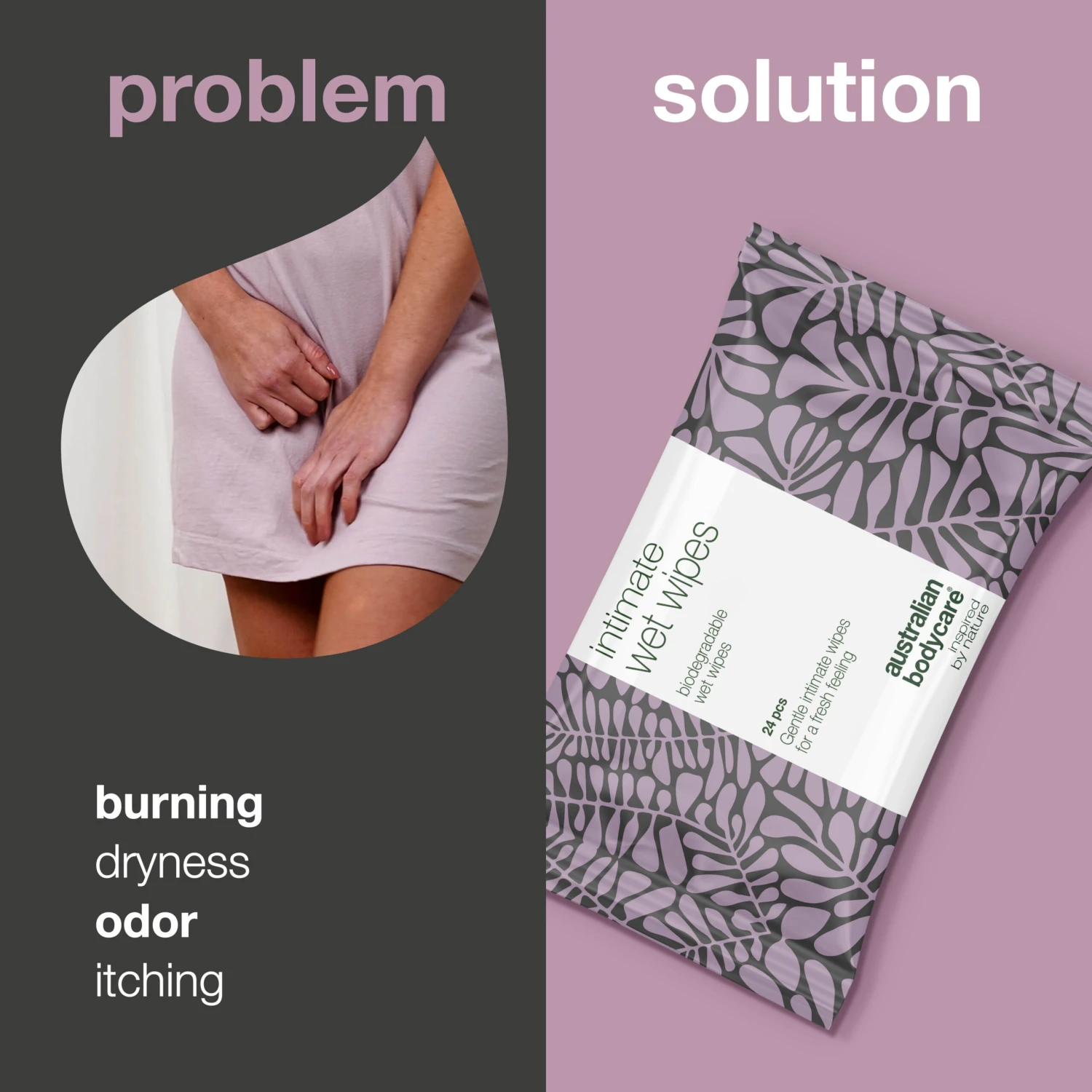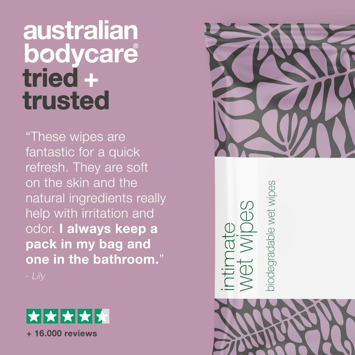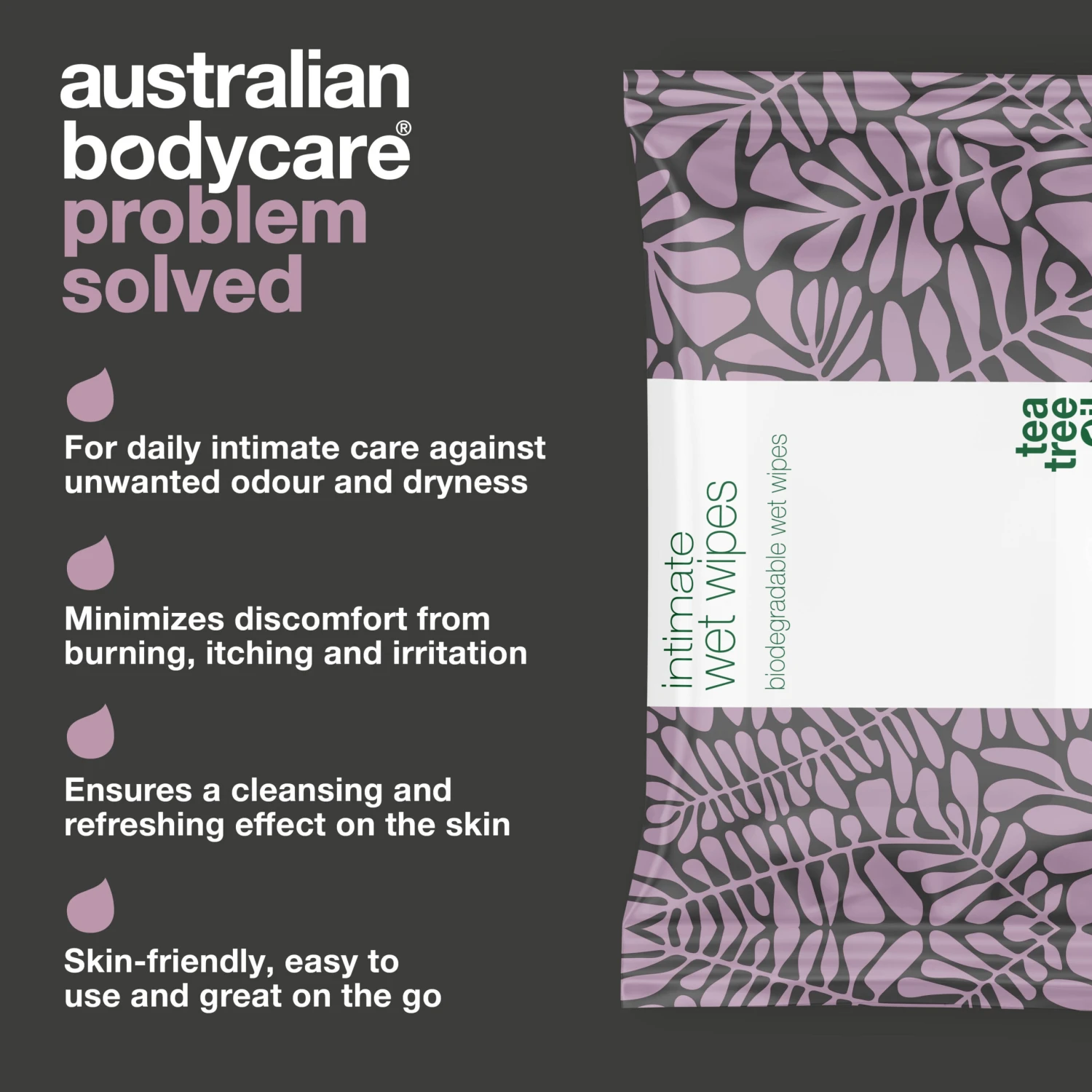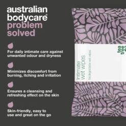 Wet wipes for the intimate area – cleans, refreshes and reduces unwanted odour, itching and other irritation | Ensures good intimate hygiene on the go, so you can minimise discomfort from burning, dryness or odour | Dermatologically tested and suitable for the intimate area | Based on 100% natural Tea Tree Oil | Made from biodegradable material.