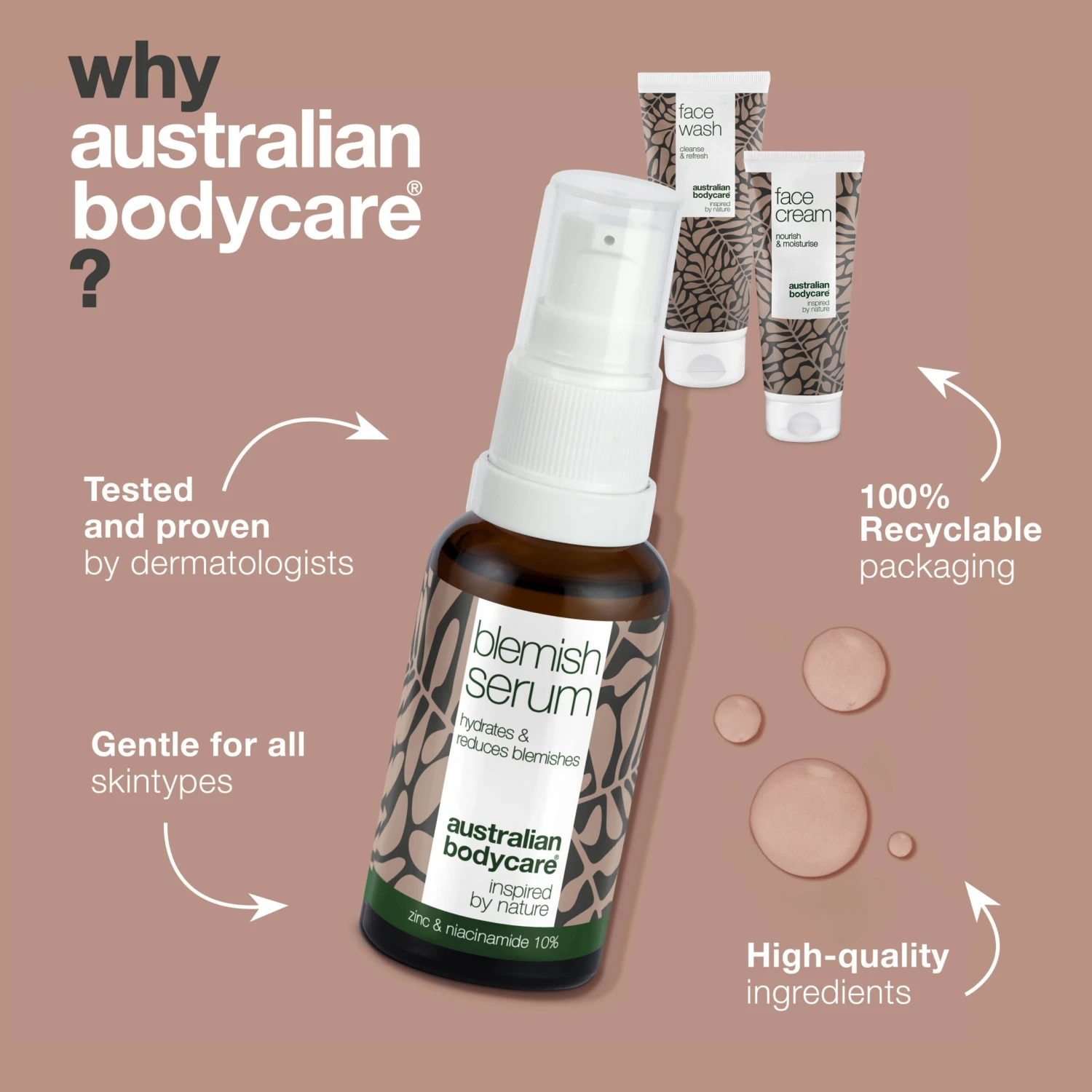 Face Wash (200 ml), Niacinamide Serum (30 ml) and Face Cream (100 ml) for daily cleansing and care of pimples, blackheads and oily skin | Natural ingredients effectively cleanse the skin from bacteria and dirt | Niacinamide-based serum ensures even and smooth skin | Contains 100% natural Tea Tree Oil from Australia.