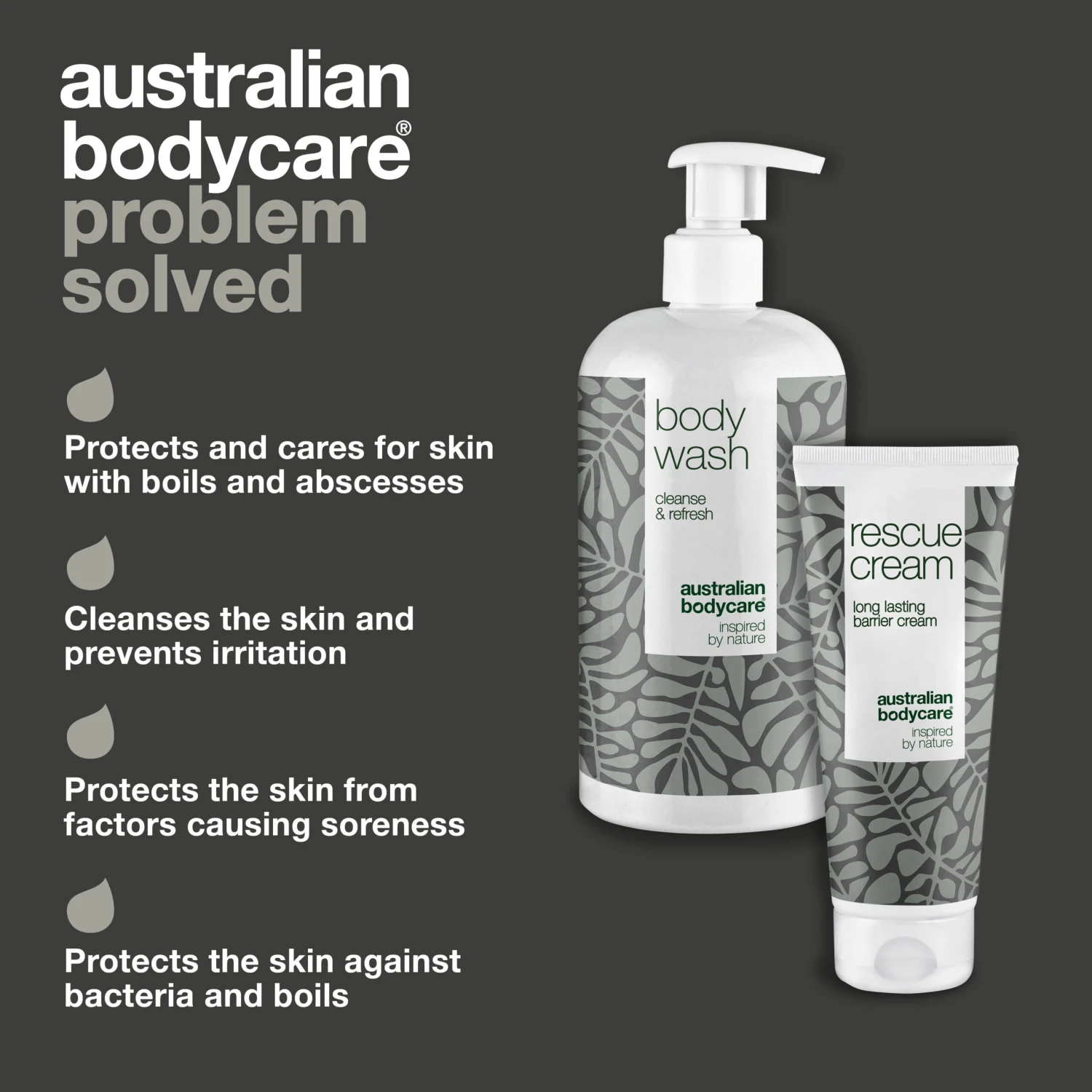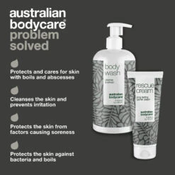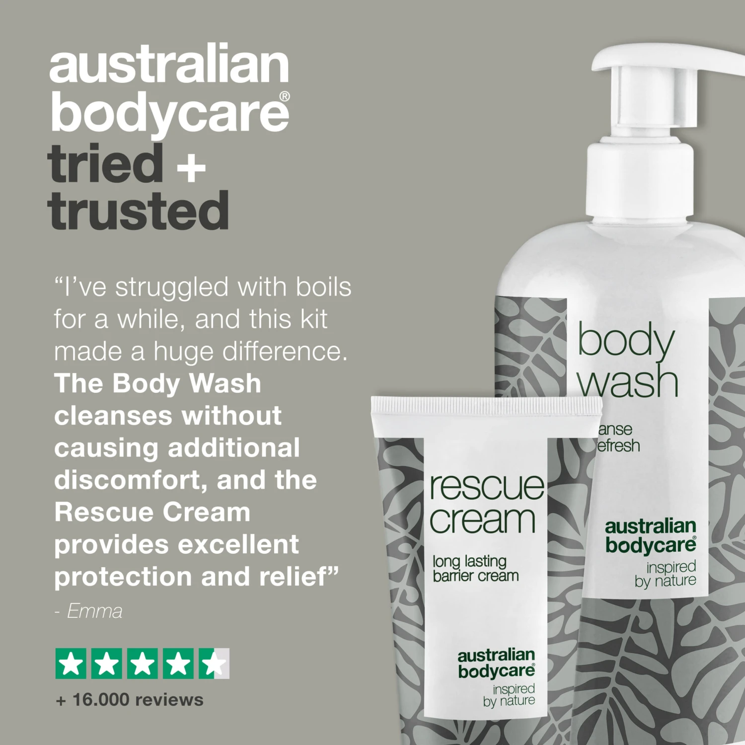 Daily care products for washing and protection of exposed skin areas | Protects and cares for skin with body boils and abscesses | Body soap cleans the skin and prevents irritation | Barrier cream keeps exposed and damaged skin dry and protected against bacteria and the development of boils.