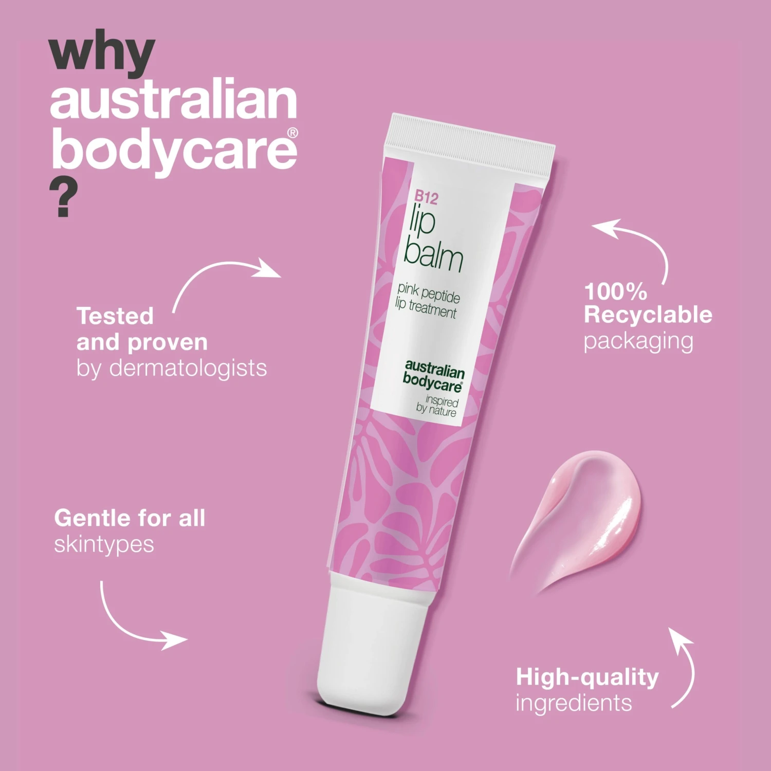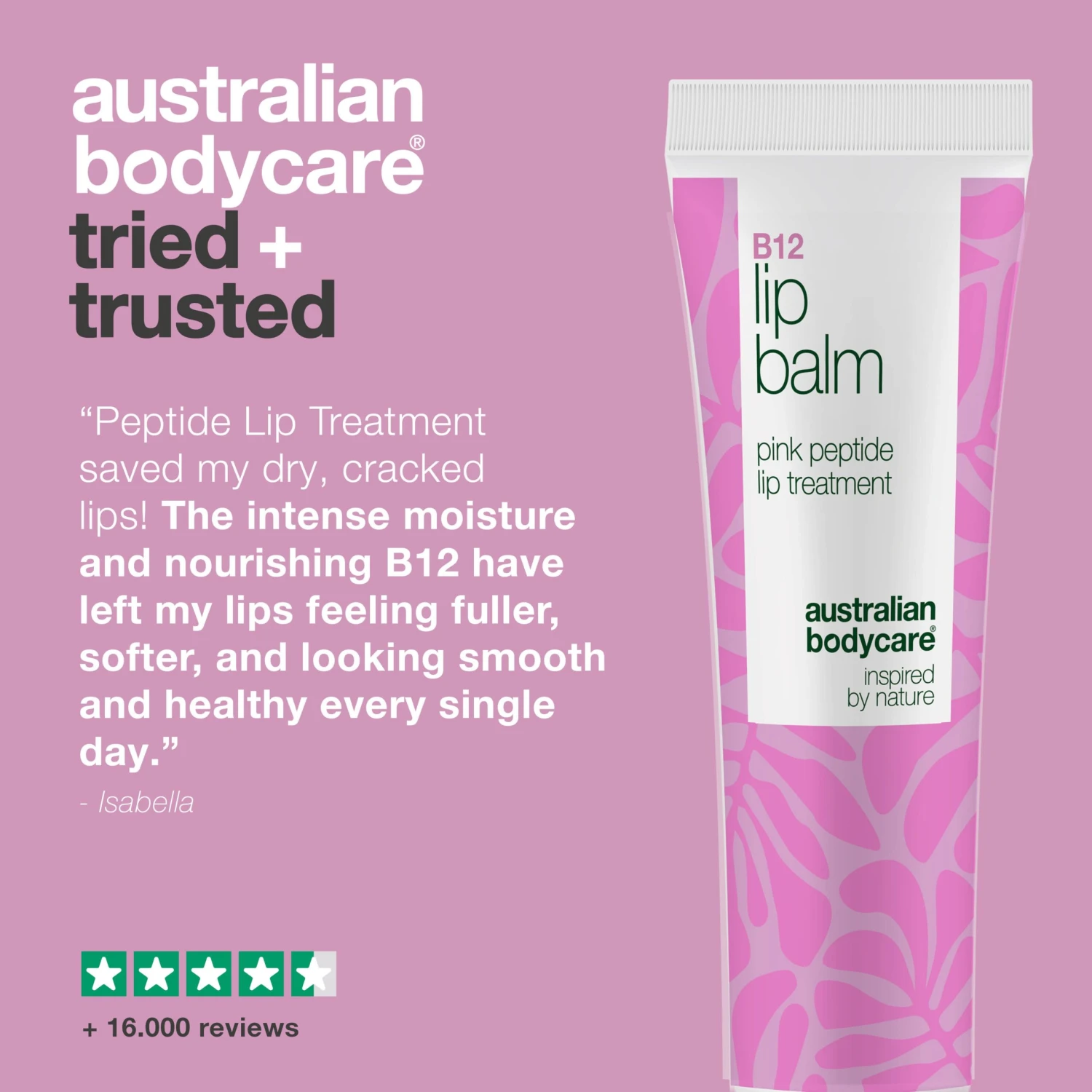 Australian Bodycare Peptide Lip Treatment is more than just an ordinary lip balm. It combines the powerful effects of Vitamin B12 with active peptides to give your lips the ultimate care. Vitamin B12 works to restore your lips’ moisture balance and strengthens the skin’s natural barrier, ensuring they stay soft and supple throughout the day. At the same time, advanced peptides provide a plumping effect that gives lips a fuller appearance and minimizes visible lines around the mouth.