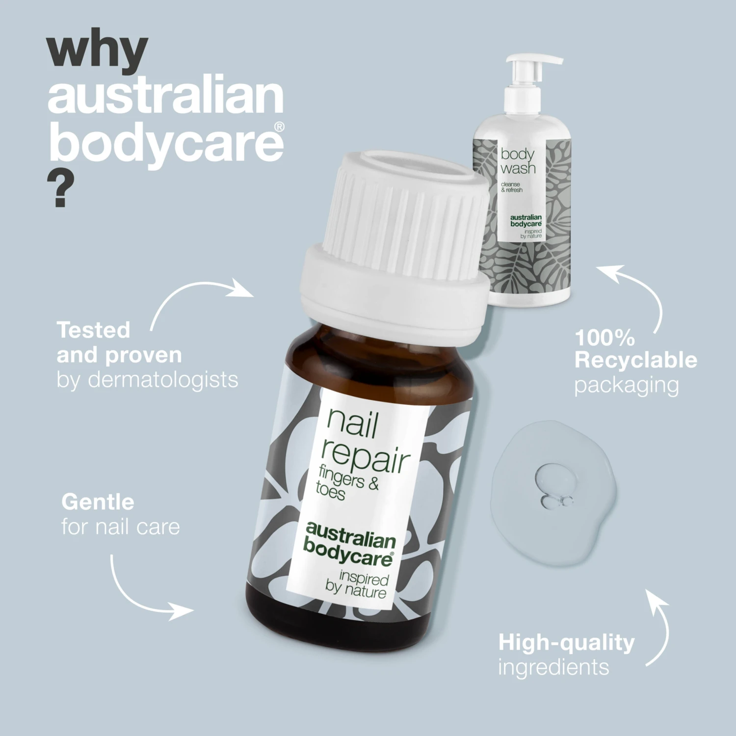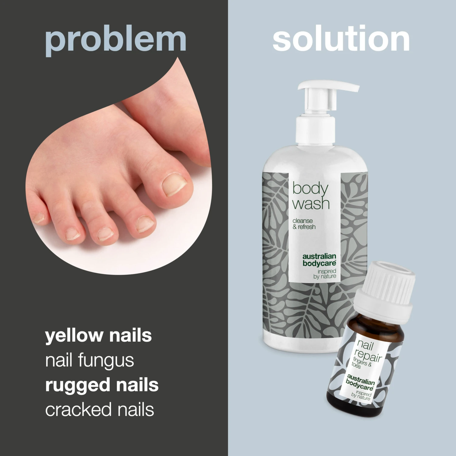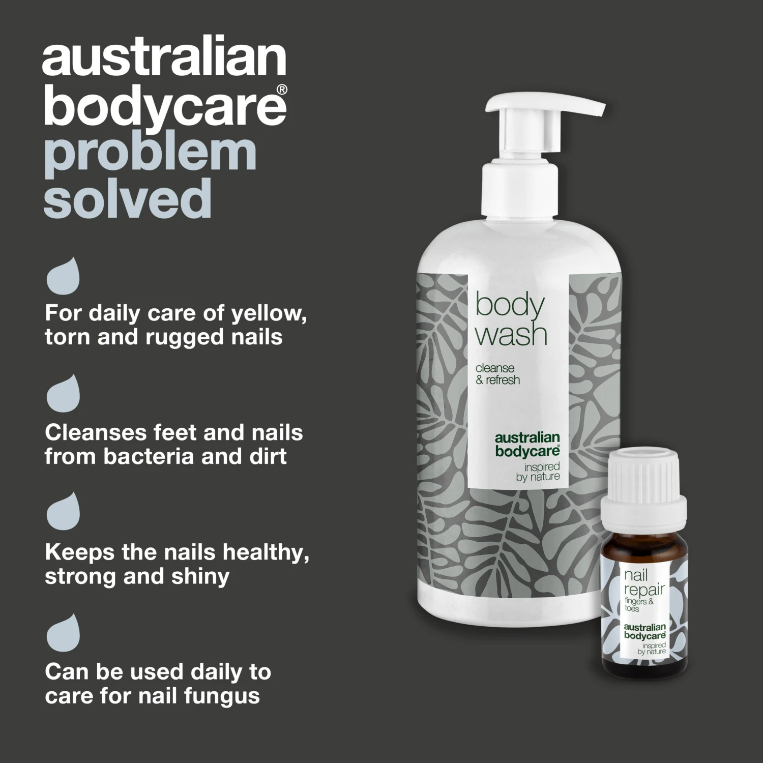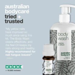 Yellow, torn, rugged nails can be cared for daily with the 2 products in this kit | Nail oil (10 ml) and Body Wash (500 ml) cleanses and nourishes your nails – can also be used for nail fungus | Body Wash efficiently cleanses feet and nails from bacteria and dirt, while the nail oil with vitamin E keeps your nails healthy and shiny | Made from 100% natural Tea Tree Oil from Australia | Dermatologically tested products.