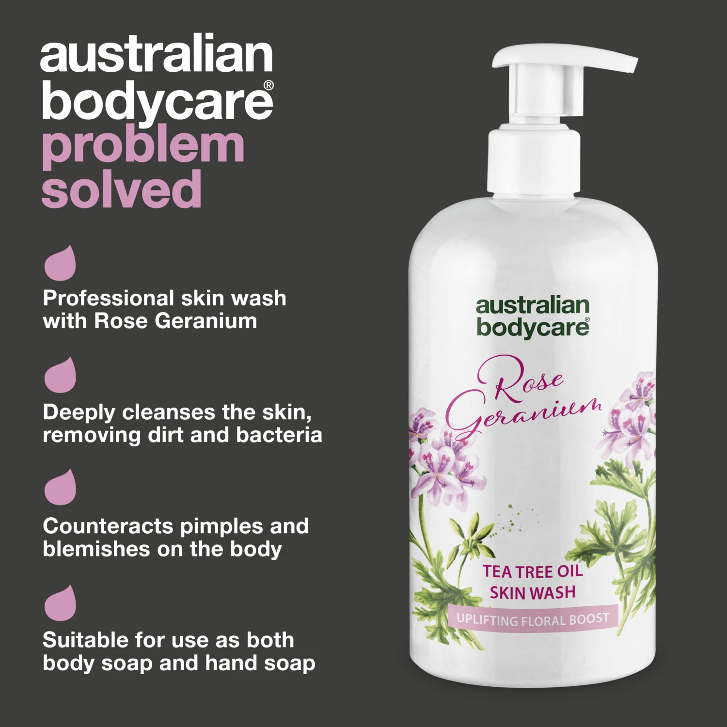 Rose Skin Wash for professional use in clinics and beauty salons | Can be used as body soap and everyday hand soap | Combats spots, blackheads and skin problems on the back, shoulders and buttocks | Soothing and calming effect on the skin | Natural active ingredients keep the skin healthy and balanced | Vegan.