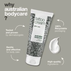 “We created this tattoo cream to provide the best possible care for tattooed skin—whether it’s a fresh design or an older tattoo in need of revival. The nourishing and soothing ingredients help maintain skin elasticity and keep colors vibrant. Inspired by nature, we’ve carefully selected active ingredients to support skin health.” – Product Developer at Australian Bodycare.