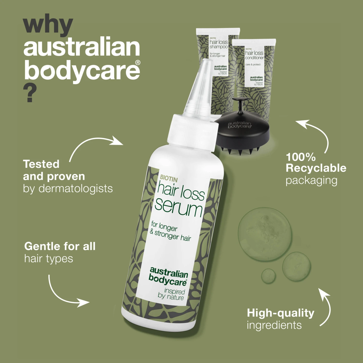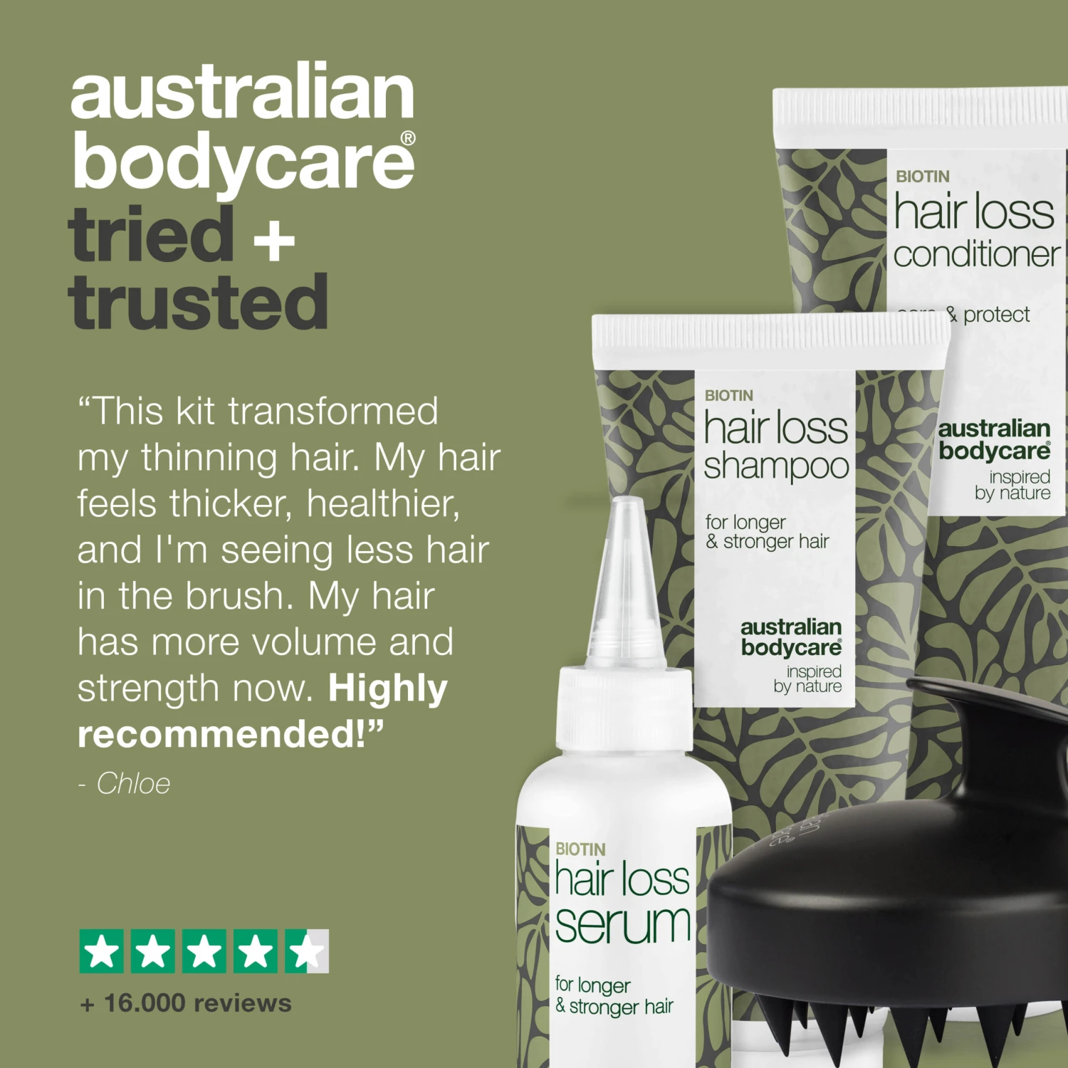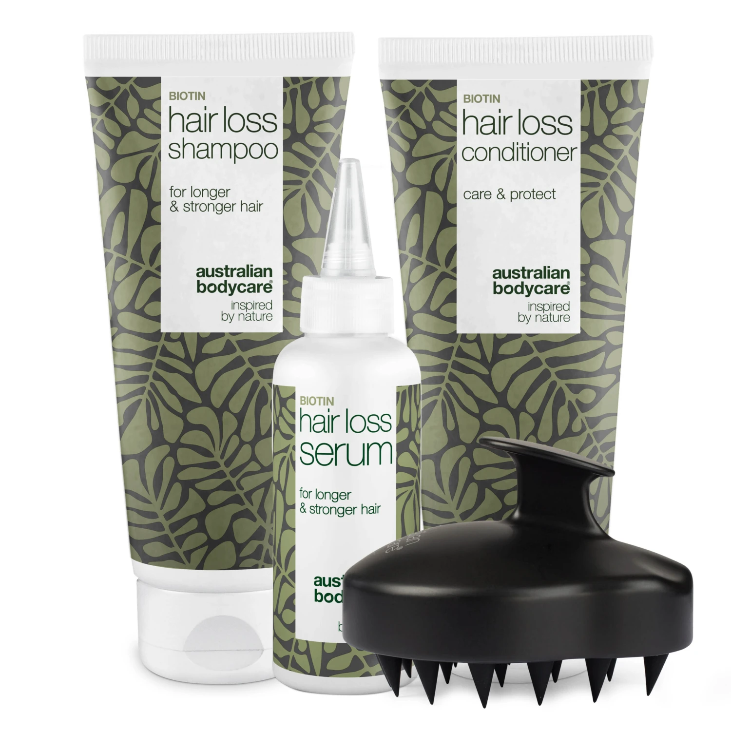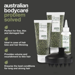 The kit consists of Hair Loss Wash 200 ml, Hair Loss Conditioner 200 ml, Hair Loss Serum 100 ml and Scalp Brush.